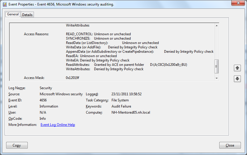 Как мы видим из текста сообщения, доступ на запись был заблокирован проверкой Политики Целостности (Integrity Policy check). Первая же ссылка на MSDN (http://msdn.microsoft.com/en-us/library/bb625963.aspx) пускается в пространные объяснения, не давая ответа на вопрос «Что делать-то будем? Людям работать нужно!» Помог Mark Minasi: http://www.minasi.com/apps/
