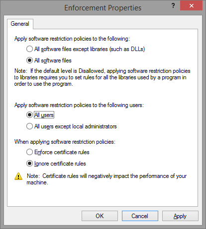 • В объекте Enforcement указываю параметр Apply to: All software files.
