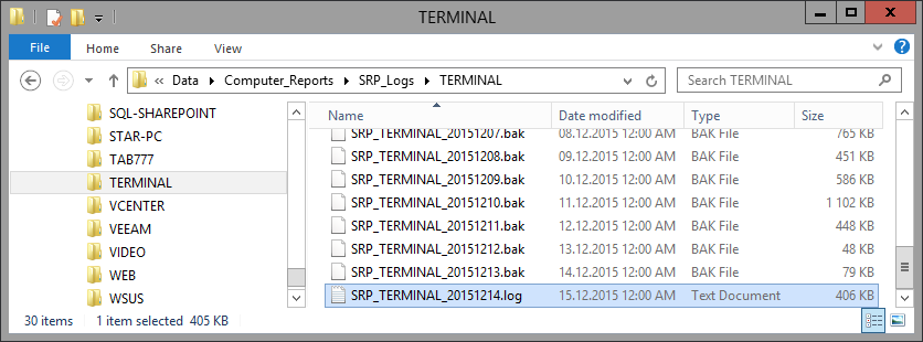Обнаружив смену даты с момента предыдущего запуска, скрипт копирует текущий журнал в файл с именем SRP_%ComputerName%_YYYYMMDD.log, после чего журнал очищается. Формула YYYYMMDD подразумевает собой «вчера» и вычисляется по формуле «%Today%-1», но это вычисление точным может не являться. Например, если последний раз компьютер работал в пятницу, 04-Dec-2015, а затем был выключен на выходные, то при включении в понедельник он обнаружит смену даты и перебросит последний журнал в файл, датируемый воскресеньем, 06-Dec-2015. Усложнять скрипт, делая его более интеллектуальным, анализируя системные журналы с целью выяснения точной даты, мне не требовалось.