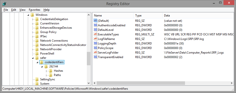 • Computer Configuration > Preferences > Windows Settings > Registry >  В ключе реестра HKLM\SOFTWARE\Policies\Microsoft\Windows\Safer\CodeIdentifiers создать значение LogFileName типа REG_SZ, равное «C:\Windows\Logs\SRP\SRP.log». Сразу обращаю внимание, что тип значения REG_EXPAND_SZ не поддерживается, поэтому указать в пути переменные окружения не получится;