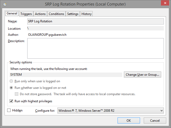 • Task > Name > «SRP Log Rotation»; Run «powershell.exe»; Arguments: «-f C:\Windows\SRP_LogRotation.ps1»