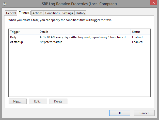• Actions > New > Start a program; Program: «powershell.exe»; Arguments: «-f C:\Windows\SRP_LogRotation.ps1»